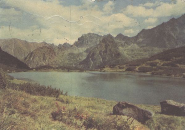 Na pierwszym planie tafla Ciężkiego Stawu. W tle pejzaż Tatr Wysokich. Od lewej: Żabi Wierch Jaworowy, ¦wistowy Szczyt, Mała Wysoka, Wielicki Szczyt i zbocza Zadniego Gerlacha.