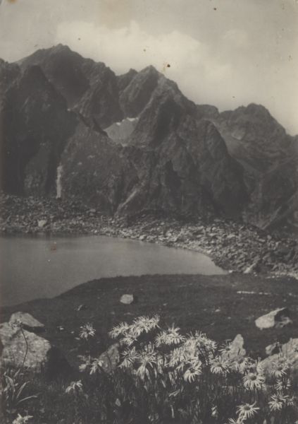 Na pierwszym planie omieg górski (Doronicum austriacum) i Litworowy Staw. W tle od lewej Rysy, Niżnie Rysy i Wyżni Żabi Szczyt.