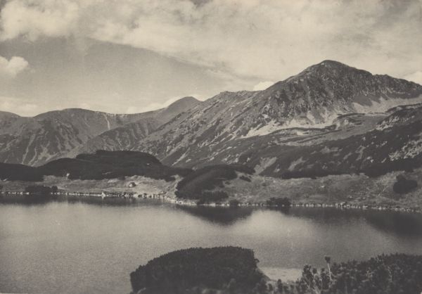Na pierwszym planie tafla Niżniego Ciemnosmreczyńskiego Stawu. W tle po prawej Cichy Wierch.
