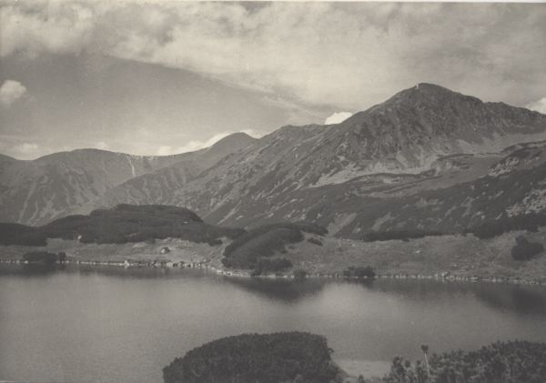 Na pierwszym planie tafla Niżniego Ciemnosmreczyńskiego Stawu. W tle po prawej Cichy Wierch.
