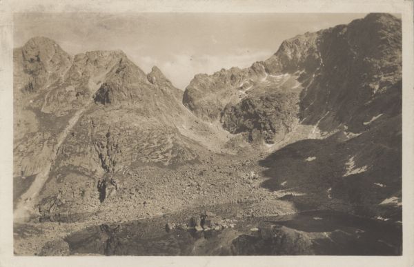 Żabie Stawy. W tle pejzaż Tatr Wysokich.