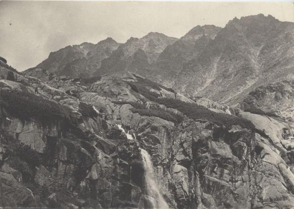 TATRY WYSOKIE. Dolina Młynicka, wodospad Skok, w tle Grań Baszt.