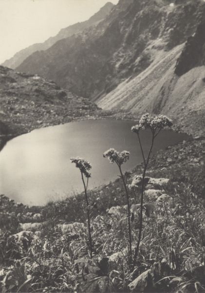 Mały Staw Hińczowy znajdujący się w Dolinie Mięguszowickiej. Na pierwszym planie miłosna górska (Adenostyles alliariae).
