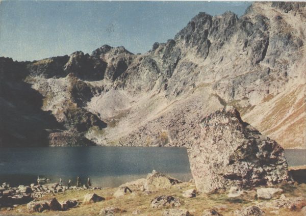 Widok na Wielki Hińczowy Staw. W głebi po lewej grupa turystów nad stawem. W tle Cubrynka, Cubryna i Mięguszowicki Szczyt.