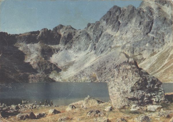 TATRY WYSOKIE - Wielki Staw Hińczowy w Hińczowej Dolinie. Od lewej Cubrynka, Cubryna i Mięguszowiecki Szczyt. Tytuł również w języku: ros., niem., ang.