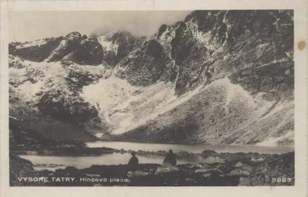 Wielki Hińczowy Staw w Dolinie Hińczowej. Na pierwszym planie odpoczywa dwoje turystów. W tle ośnieżona Cubryna i Mięguszowieckie Szczyty. Na dole tytuł.