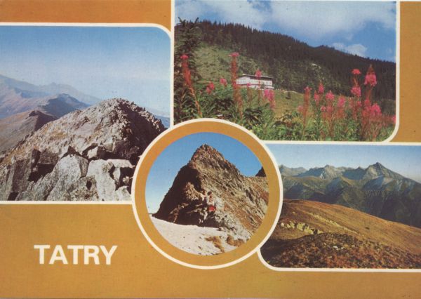 Pocztówka 4. elementowa. Na zdjęciu po lewej stronie widok ze Świnicy, w tle Giewont. Obok schronisko - hotel górski na Polanie Kalatówki. Poniżej turysta na Przełęczy Zawrat. Obok widok z Tomanowej w kierunku Tatr Wysokich, widoczny Krywań.