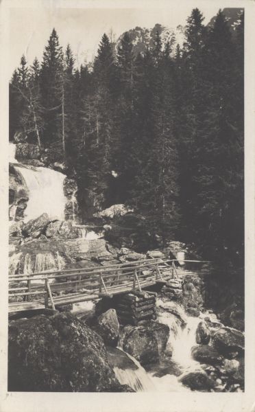 Widok na Wodospady Zimnej Wody w Dolinie Zimnej Wody. Na pierwszym planie widać mostek na szlaku.
