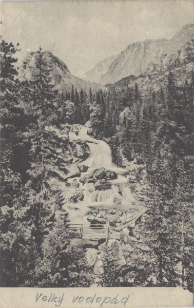 Widok na Wielki Wodospad Zimnej Wody w Dolinie Zimnej Wody. W tle las i szczyty otaczające Doline Małej Zimnej Wody. Na pierwszym planie mostek. Pod zdjęciem dopisane: Velký vodopád.