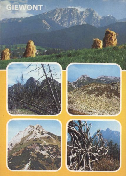 Pocztówka 5. elementowa. Widoki na Giewont: Z pasma Gubałówki, na pierwszym planie kopy siana