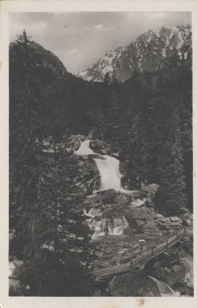 Wodospady Zimnej Wody. W tle las, powyżej po lewej Rywociny, po prawej masyw Łomnicy. Na dole mostek.