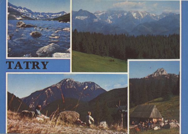 Pocztówka 4. elementowa. Na zdjęciu po lewej stronie u góry Dolina Pięciu Stawów Polskich. Obok widok na panoramę Tatr z Głodówki. Poniżej turyści na Polanie Chochołowskiej, w tle Kominiarski Wierch. Obok szałas w Dolinie Strążyskiej, w tle Sarnia Skała, przed szałasem turyści. Napis: TATRY.