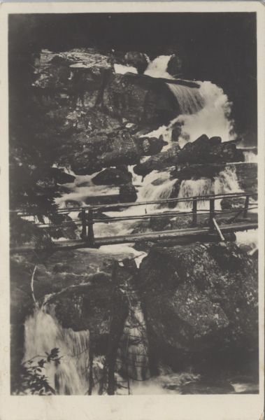 Tatry Wysokie. Wodospad w Dolinie Staroleśnej. Tytuł również w języku: niem., węg. (Błędny opis, wodospad znajduje się w Dolinie Zimnej Wody)