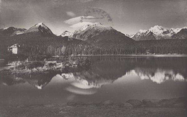 Widok Szczyrbskiego Jeziora z odbijającymi się wodzie ośnieżonymi szczytami. Od lewej: Szczyrbskie Solisko, Szczyrbski Szczyt, Skrajna Baszta, Kopa Popradzka i Wysoka. Na brzegu jeziora willa Marina.
