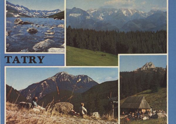 Pocztówka 4. elementowa. Na zdjęciu po lewej stronie u góry Dolina Pięciu Stawów Polskich. Obok panorama Tatr z Głodówki. Poniżej turyści na Polanie Chochołowskiej, w tle Kominiarski Wierch. Obok szałas w Dolinie Strążyskiej, w tle Sarnia Skała, przed szałasem turyści. Napis: TATRY.