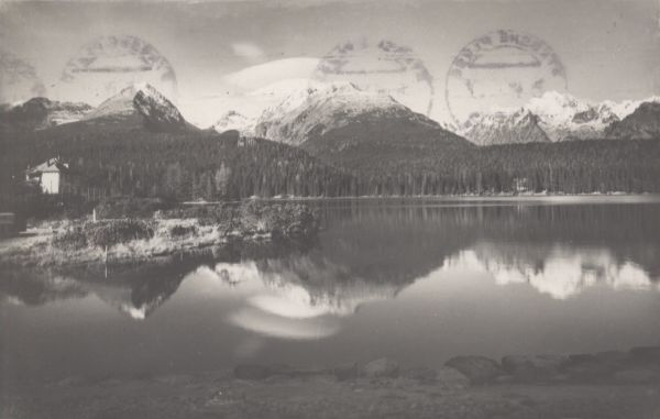 Widok Szczyrbskiego Jeziora z odbijającymi się wodzie ośnieżonymi szczytami. Od lewej: Szczyrbskie Solisko, Szczyrbski Szczyt, Skrajna Baszta, Kopa Popradzka i Wysoka. Na brzegu jeziora willa Marina.