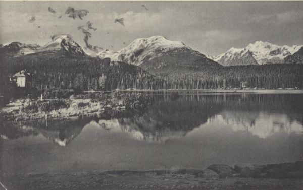 Widok Szczyrbskiego Jeziora z odbijającymi się wodzie ośnieżonymi szczytami. Od lewej widoczne: Szczyrbskie Solisko, Szczyrbski Szczyt, Skrajna Baszta, Kopa Popradzka i Wysoka. Na brzegu jeziora willa Marina.