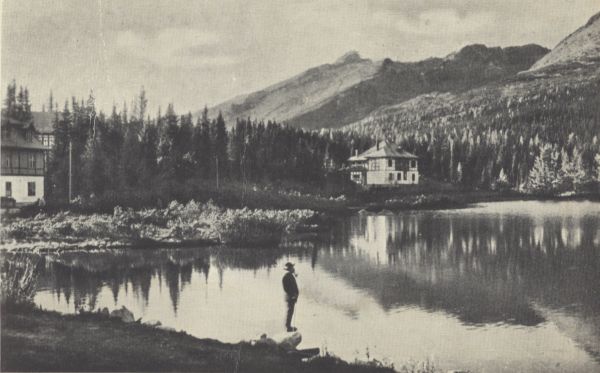 Widok na Szczyrbskie Jezioro. W tle od lewej szczyty: Krywań, Ostra i Solisko. Nad jeziorem wśród drzew widoczna po prawej stronie willa Maryna. Na pierwszym planie stoi turysta z fajką.