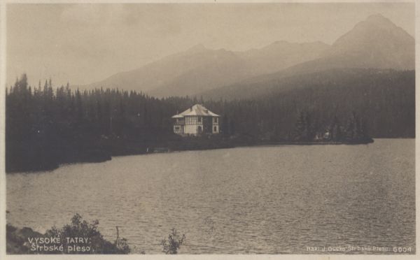 Widok na Szczyrbskie Jezioro. Na brzegu willa Marina. W tle Krywań, Ostra i Solisko. Na dole tytuł i nakładca.