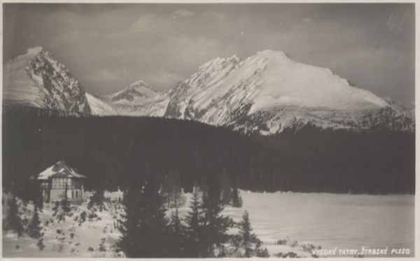 Zimowy pejzaż nad Szczyrbskim Jeziorem. Po lewej willa Maryna, w tle o¶nieżone szczyty: Solisko, Szczyrbski Szczyt, Szatan i Skrajna Baszta. Na dole wpisany tytuł.