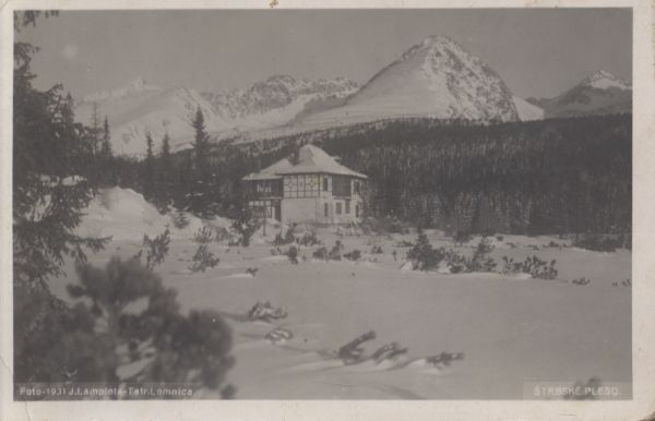 Zimowy pejzaż nad Szczyrbskim Jeziorem. Na brzegu willa Maryna, w tle o¶nieżone szczyty: Krywań, Siodełkowa Kopa, Ostra, Solisko i Szczyrbski Szczyt. Na dole wpisany tytuł i nazwisko fotografa.