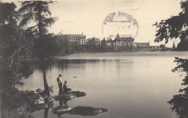 Widok na Szczyrbskie Jezioro i zabudowania sanatoryjno hotelowe na brzegu. Na pierwszym planie dwie osoby.