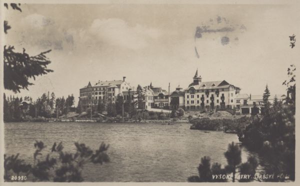 Widok na Szczyrbskie Jezioro. Na brzegu zabudowania sanatoryjno hotelowe.