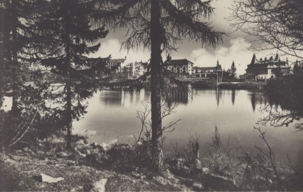 Szczyrbskie Jezioro. Nad brzegiem widoczne zabudowania sanatoryjno hotelowe. Na pierwszym planie drzewa.