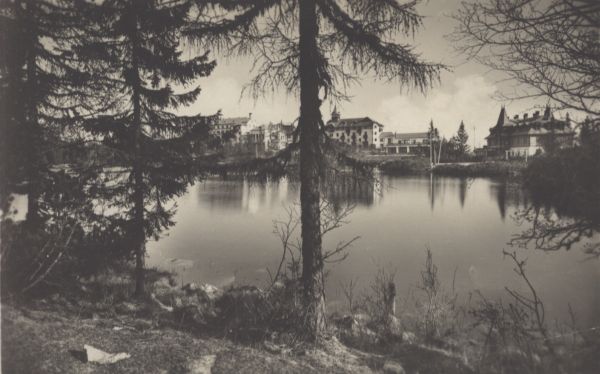 Szczyrbskie Jezioro. Nad brzegiem widoczne zabudowania sanatoryjno hotelowe. Na pierwszym planie drzewa.