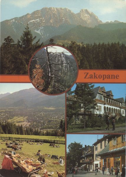 Pocztówka 5. elementowa. Na górnym zdjęciu widok na Giewont. Poniżej widok ze Ścieżki Nad Reglami. Poniżej po lewej stronie turyści opalający się na Gubałówce, w tle Zakopane. Obok dom wypoczynkowy Barbara. Poniżej ulica Krupówki w Zakopanem.