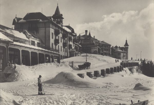 Sanatoria Krywań i Hviezdoslav w Szczyrbskim Jeziorze zim±. Na pierwszym planie narciarz stoj±cy na ulicy, dalej sanie i spaceruj±cy kuracjusze.
