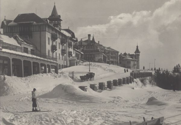 Sanatoria Krywań i Hviezdoslav w Szczyrbskim Jeziorze zimą. Na pierwszym planie narciarz stojący na ulicy, dalej sanie i spacerujący kuracjusze.