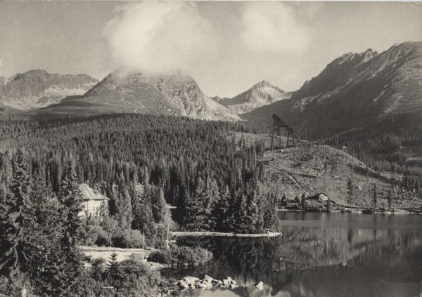 Widok na Szczyrbskie Jezioro. W tle od lewej szczyty: Ostra, Wielkie Solisko, Szczyrbski Szczyt i Grań Baszt. Nad jeziorem w¶ród drzew widoczna willa Marina. W głębi po prawej stronie widać star± skocznię.