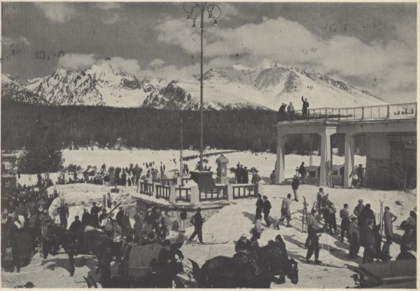 Widok na osadę Szczyrbskie Jezioro w zimowej scenerii przed zawodami narciarskimi. Przed budynkiem kawiarni tłumy turystów i narciarzy, na pierwszym planie sanie. W tle panorama Tatr od Wysokiej po Kończyst±.