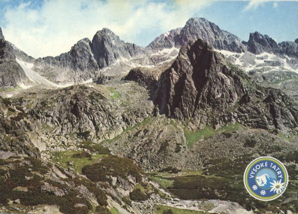 VYSOKÉ TATRY - WYSOKIE TATRY - HOHE TATRA - THE HIGH TATRAS Veľká Studená dolina - pohľad na Ostrý štít /2360 m/, Širokú vežu /2461 m/, Priečne sedlo /2352 m/, Priečnu vežu, v popredí Strelecká veža /2130 m/.