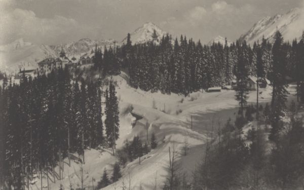 Widok na osadę Szczyrbskie Jezioro w zimowej scenerii. Na pierwszym planie las, w tle Krywań, Ostra, Solisko, Szczyrbski Szczyt i Baszty.