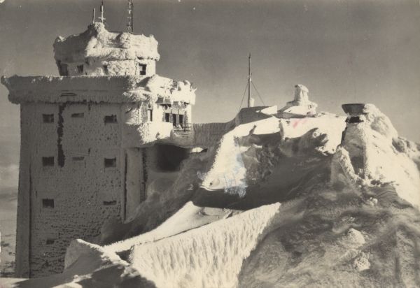 Ośnieżona stacja kolei linowej na szczycie Łomnicy.
