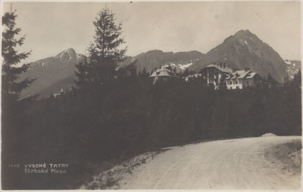 Osada Szczyrbskie Jezioro, zabudowania hotelowe. W tle szczyty: Krywań, Ostra i Szczyrbskie Solisko. Na pierwszym planie droga. Na dole wpisany tytuł.