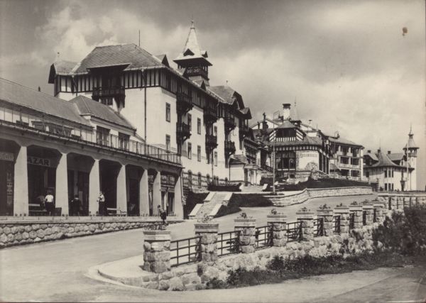 Widok na budynki: Krywań i Hviezdoslav w Szczyrbskim Jeziorze. Na pierwszym planie ulica.