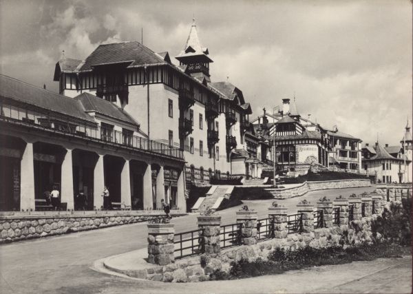 Widok na budynki sanatoryjne: Krywań i Hviezdoslav w Szczyrbskim Jeziorze. Na pierwszym planie ulica.