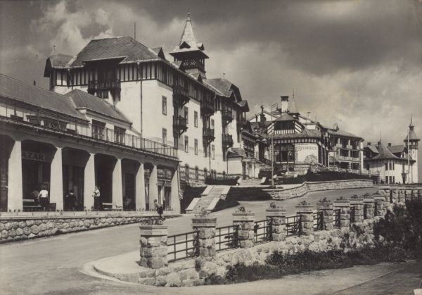 Widok na budynki: Krywań i Hviezdoslav w Szczyrbskim Jeziorze. Na pierwszym planie ulica.