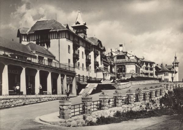 Widok na budynki sanatoryjne: Krywań i Hviezdoslav w Szczyrbskim Jeziorze. Na pierwszym planie ulica.
