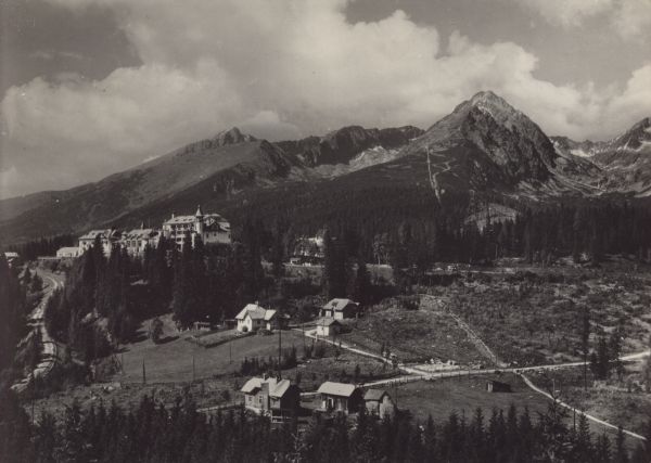 Osada Szczyrbskie Jezioro. Na pierwszym planie zabudowania i drogi, w głębi sanatoria. W tle szczyty: Krywań