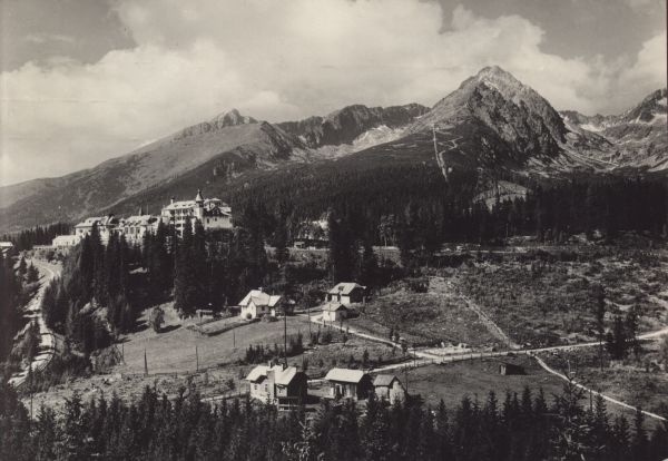 Osada Szczyrbskie Jezioro. Na pierwszym planie zabudowania i drogi, w głębi sanatoria. W tle szczyty: Krywań, Solisko i Szczyrbski Szczyt.