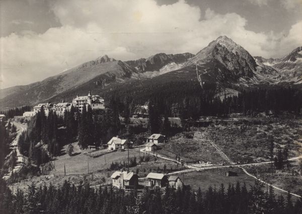 Osada Szczyrbskie Jezioro. Na pierwszym planie zabudowania i drogi, w głębi sanatoria. W tle szczyty: Krywań, Solisko i Szczyrbski Szczyt.