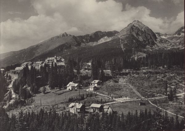 Osada Szczyrbskie Jezioro. Na pierwszym planie zabudowania i drogi, w głębi sanatoria. W tle szczyty: Krywań, Solisko i Szczyrbski Szczyt.