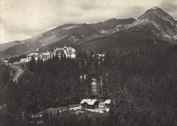 Widok na osadę Szczyrbskie Jezioro i jej otoczenie. W dali zabudowania sanatoryjne. W tle szczyty: Krywań, Ostra i Szczyrbskie Solisko.