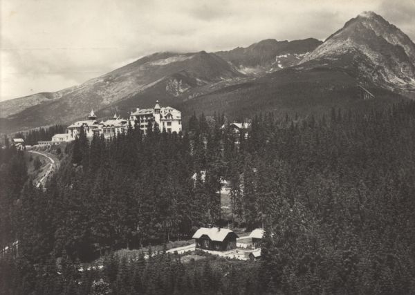 Widok na osadę Szczyrbskie Jezioro i jej otoczenie. W dali zabudowania sanatoryjne. W tle szczyty: Krywań, Ostra i Szczyrbskie Solisko.