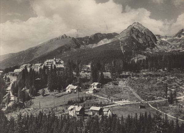 Osada Szczyrbskie Jezioro. Na pierwszym planie zabudowania i drogi, w głębi sanatoria. W tle szczyty: Krywań, Ostra i Solisko. Pod Skrajnym Soliskiem widoczna skocznia narciarska.