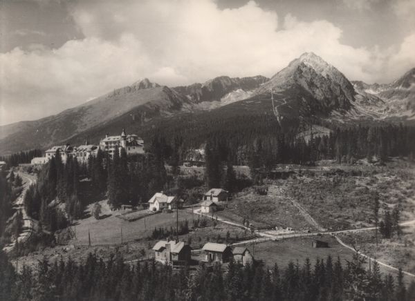 Osada Szczyrbskie Jezioro. Na pierwszym planie zabudowania i drogi, w głębi sanatoria. W tle szczyty: Krywań, Szczyrbskie Solisko i Szczyrbski Szczyt.